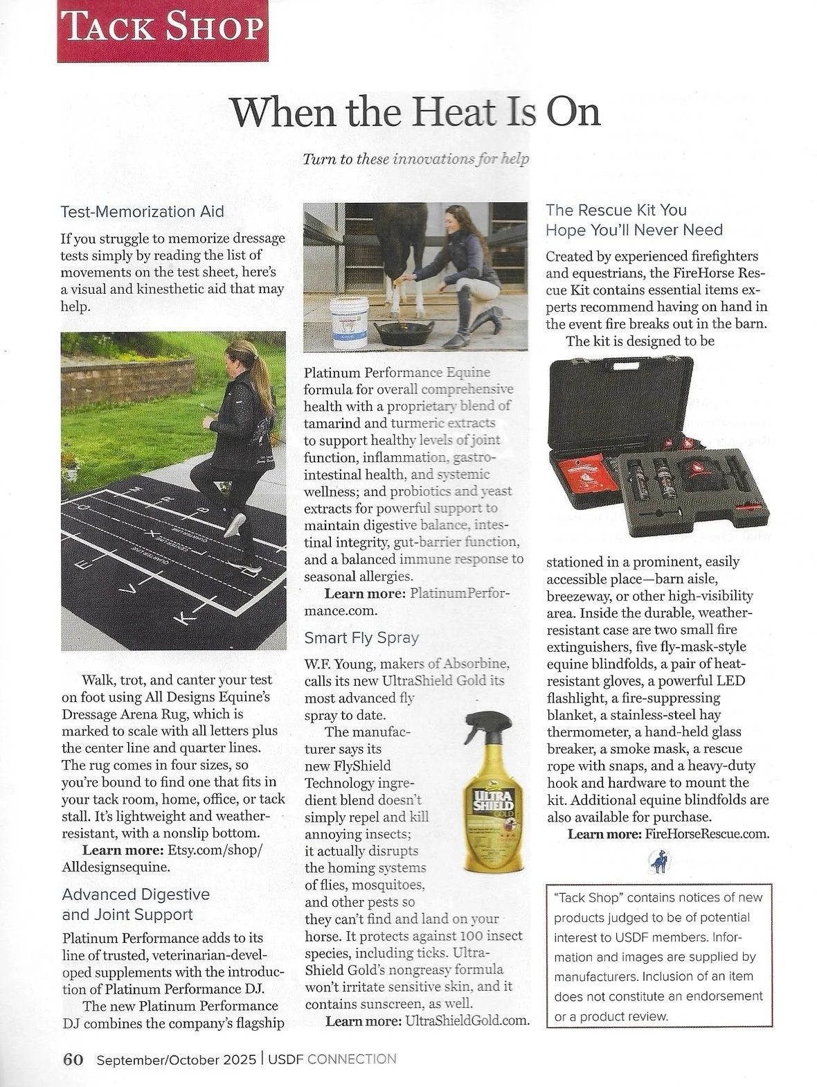 Kentucky Horse Park, Lexington, KY (September 4, 2025) – FireHorse Rescue Kits, a pioneering barn fire safety company founded by career firefighters and lifelong equestrians, was featured in the September/October 2025 issue of USDF Connection Magazine's Tack Shop section, recognizing the company's groundbreaking contributions to equestrian safety. The United States Dressage Federation (USDF) is the national governing body for the sport of dressage, and their publication, the USDF Connection, recognizes new products believed to be of interest to its members in the 'Tack Shop' section.