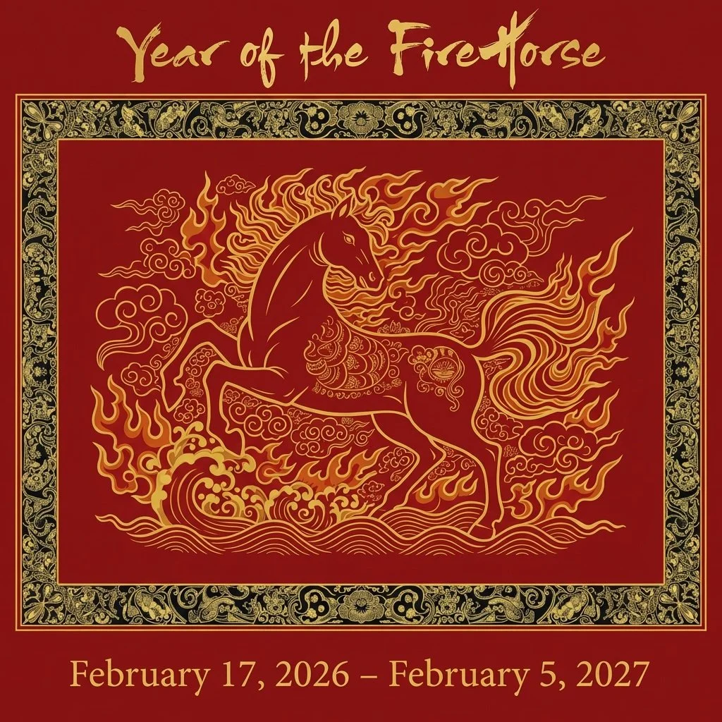 The Chinese Zodiac recognizes the Year of the FireHorse from February 17, 2026 through February 5, 2027. The Horse Year repeats every twelve years, but each cycle combines with a different element. The Fire Horse Year comes only once every sixty years. The last Fire Horse Year occurred in 1966, and the next after 2026 will be in 2086.